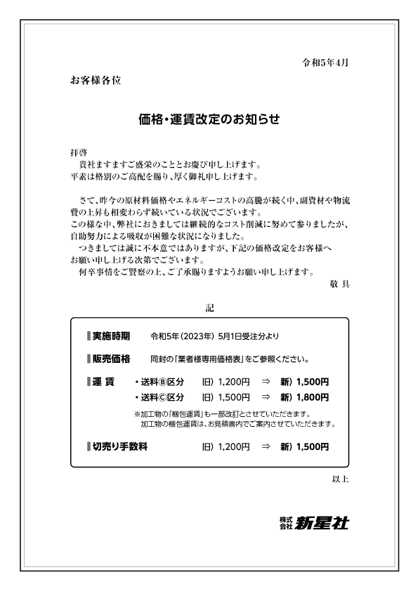 価格改定のお知らせ〈5月1日から適用〉