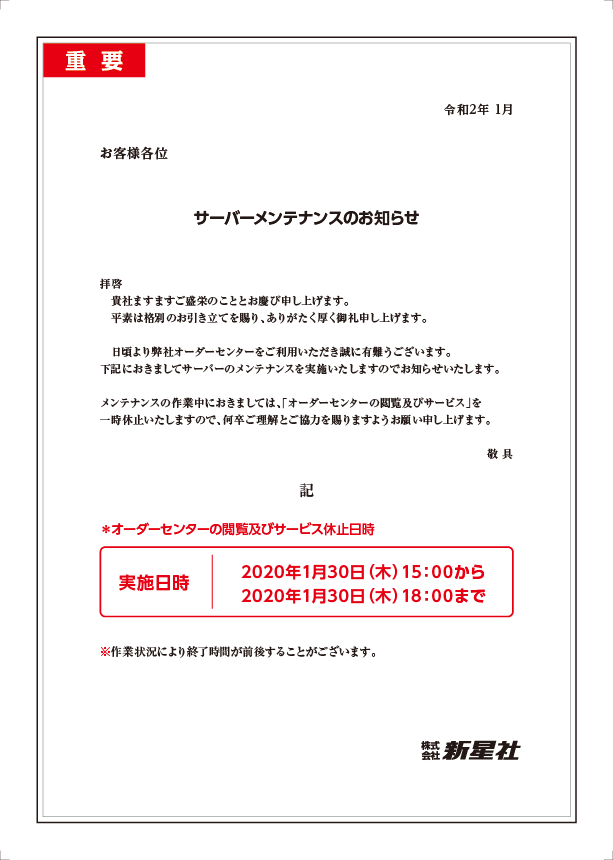 新星社オンラインショップ サーバーメンテナンスのお知らせ