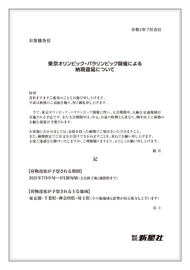 東京オリンピック・パラリンピック開催による納期遅延について