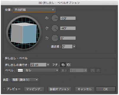 線を選択したまま〔効果〕→〔3D〕→〔押し出し・ベベルオプション〕を適用。