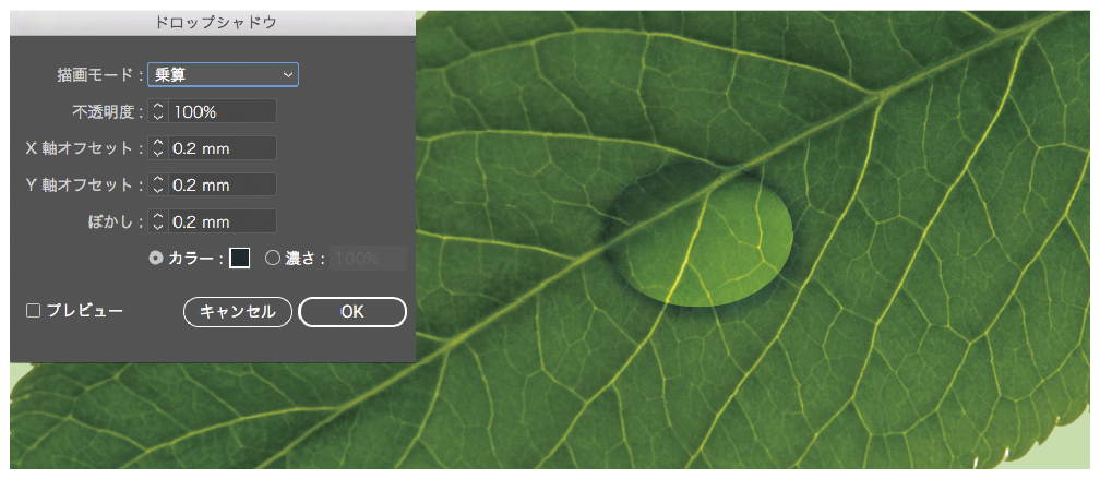 描画モードを乗算にして、上記の数値で設定します。背景の写真によって、オフセットやぼかしを調整してください。