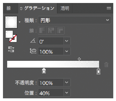 楕円形ツールにて正円を作り、グラデーションを適用します。白から始まり、端を白の「不透明度0%」に設定します。