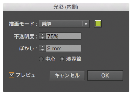 背面の文字と前面の文字を選択し、〔効果〕→〔スタイライズ〕→〔光彩(内側)〕を選びます。