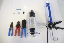 • 圧着ペンチ・ヒートガン・コーキング剤・結束バンド・コードステッカー類・圧着スリーブ・熱収縮チューブ・アルミ複合板等ベース板など道具と材料を準備します。
