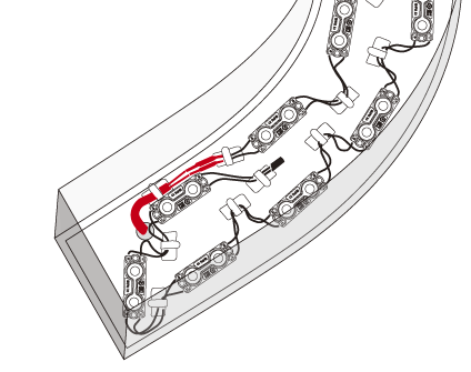 • 配線が光源の邪魔となり影が出てしまうので、片方のモジュールを回転させ、配線を螺旋にすると光源の邪魔にならず、また、収まりがよくなります。