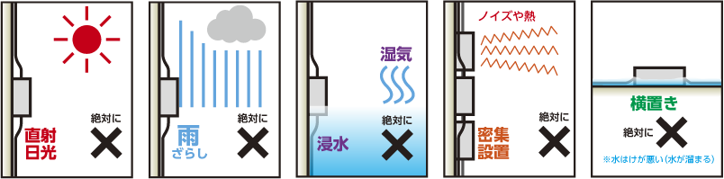 粉塵・衝撃・腐食性ガス・可燃性ガス・薬品・塩害・雪害・紫外線・使用温度を超える高温 落雷・動植物被害・ノイズ等の製品に悪影響を与える場所 など