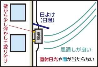 ・風通しの良い日陰に設置(日よけを設置し、直射日光 や雨ざらし状態から出来る 限りガードしてください)