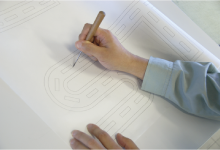 • チャンネル文字の押縁より小さいサイズのアルミ複合板等のベース板に、配置レイアウト図原寸原稿を当て、罫書きを行います