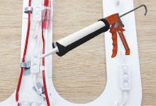 • 両面テープだけでは接着が弱いので、シリコンコーキング剤でモジュールの左右を接着、固定します。