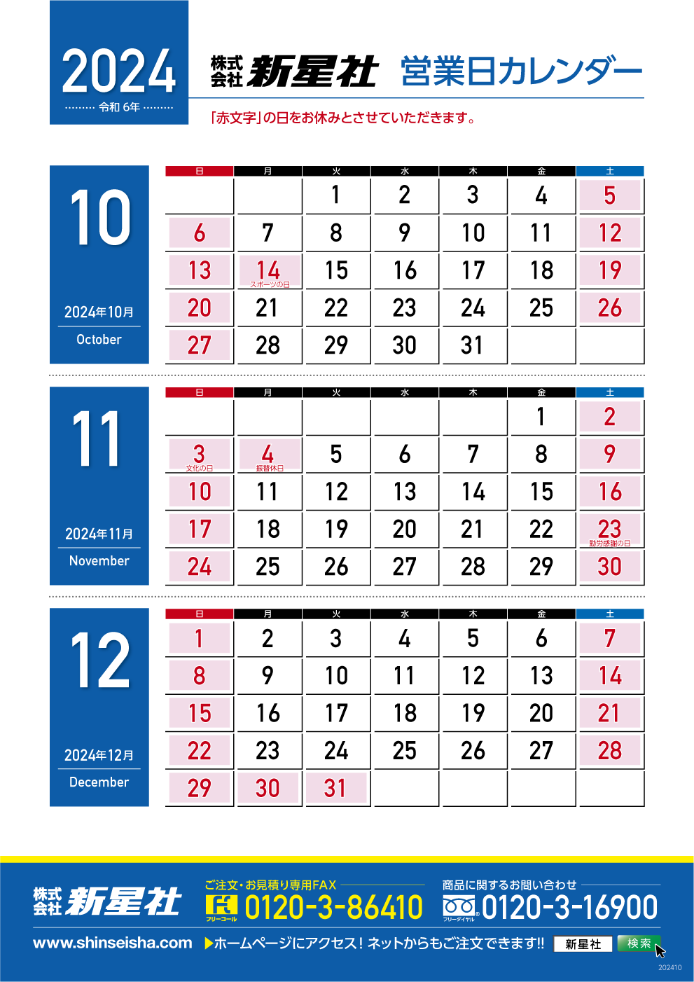 営業日カレンダー 2024年10月〜12月