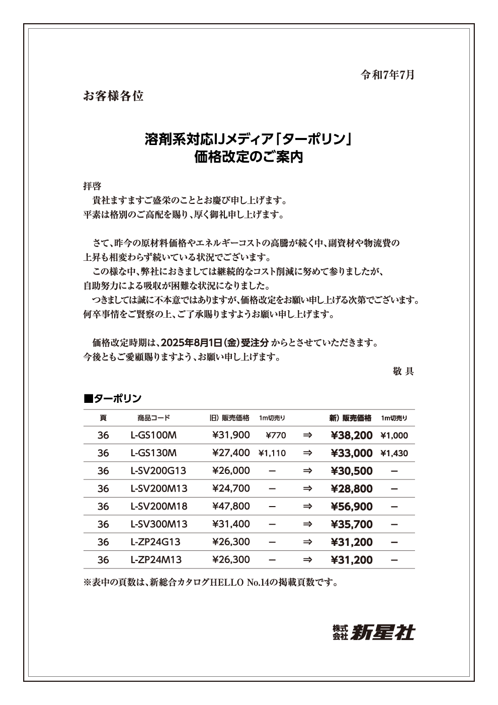 溶剤系対応IJメディア「ターポリン」 価格改定のご案内〈8月1日から適用〉
