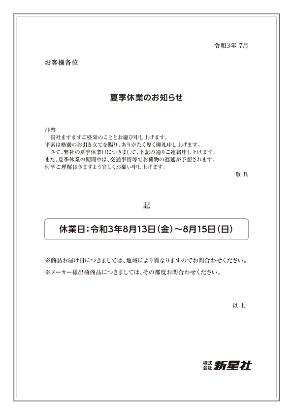 夏季休業のお知らせ